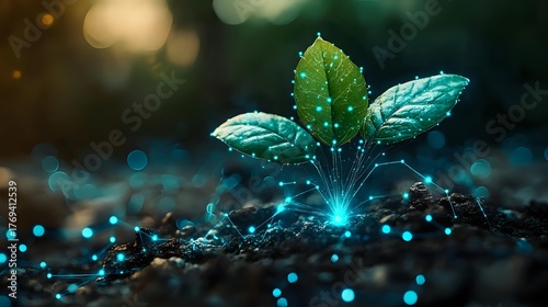 Young green plant sprout growing from soil with glowing blue light effects and bokeh background, representing growth, innovation and environmental technology.