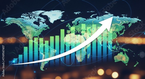Global economic growth trend illustration with upward arrow chart and world map background