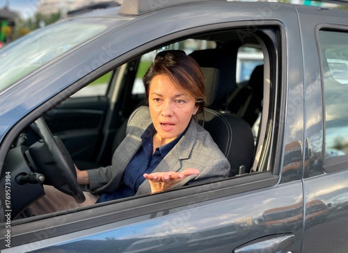 Close up of Caucasian pretty woman sitting in auto looking through window with pretentious face expression. Traffic. Woman driver unhappy with road trip. Trip concept