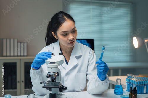Young Asian woman scientist wearing gloves and lab coat, holding test tube, looking at microscope in a laboratory