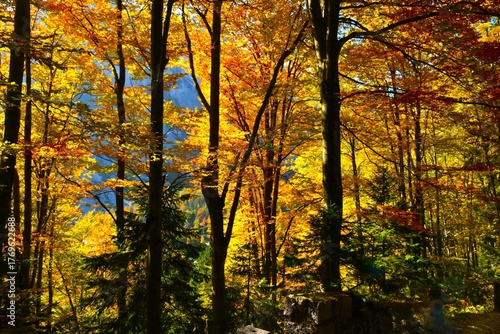 Orange and yellow colored autumn broadleaf, deciduous, temperate forest