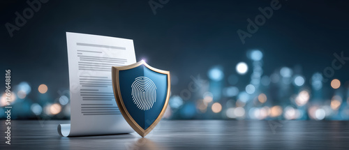 Secure document with fingerprint shield protecting data security and privacy in modern office setting conveying trust and protection