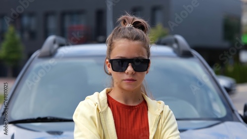 Caucasian cool young teen girl standing in front of car on street looking at camera chewing a gum. Close up. Stylish teenager girl with serious face expression. Outdoor