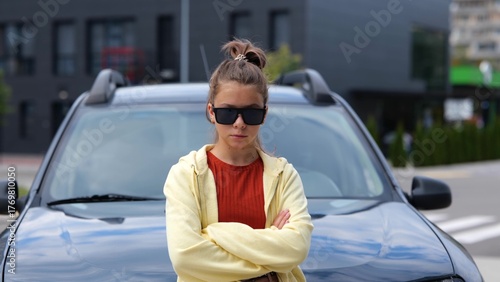 Pretty cool young teenager girl in black sunglasses standing in front of car on street looking at camera chewing a gum. Close up. Stylish pretentious teen smiling at camera.