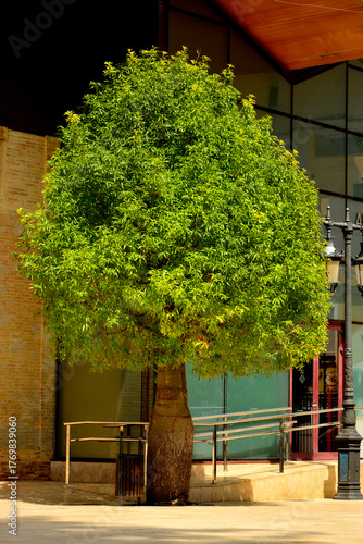drzewo butelkowe rosnące w mieście obok budynku, Puchowiec wspaniały, Ceiba speciosa, floss silk tree, bottle tree, floss silk tree, bottle tree is also called silk floss tree, grows in center of city