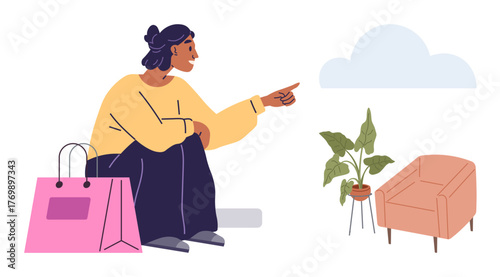 Woman seated with a bright shopping bag, gesturing towards a stylish armchair and potted plant under a cloud. Ideal for retail, interior design, shopping, lifestyle, leisure, home decoration