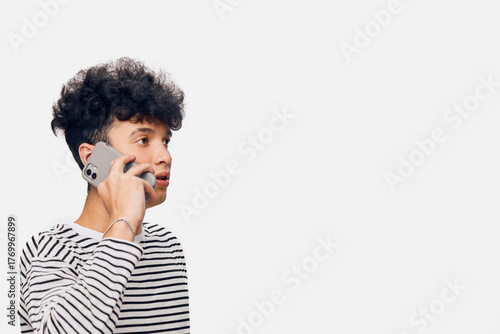 Young man talking on smartphone wearing a striped shirt, isolated on white background, casual style, communication concept.
