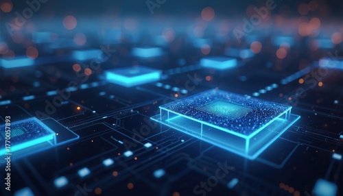 Abstract blue glowing circuit board with microchips and data streams. Digital network concept for tech backgrounds and futuristic info systems.