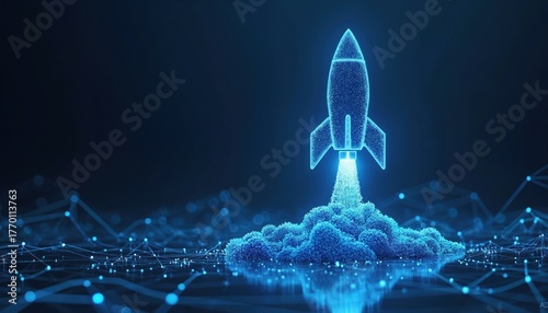 Digital illustration of rocket launch on dark blue tech background. Glowing connected dots, lines represent rapid growth concept. Low poly wireframe art digital growth with arrows up, abstract