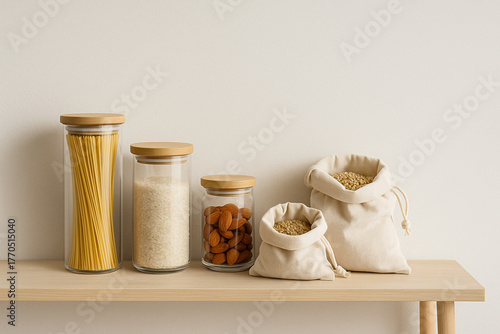 Glass jars and cotton bags filled with grains, pasta, and nuts on wooden shelf. Minimal zero waste kitchen organization.