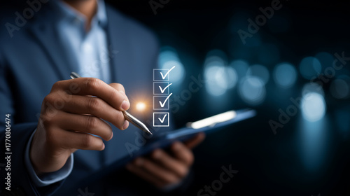Faceless businessman presenting online document validation icon interface quality assessment management checklist business evaluation process market data report analysis consul
