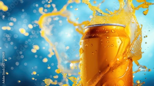A vibrant advertising poster photo of an orange soda can floating in mid-air, with bright yellow soda liquid splashing and suspended around it, dynamic motion captured in high detail,