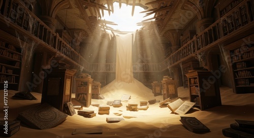Submerged sanctuary antiquated library consumed by the sands of time evoking mystery and history