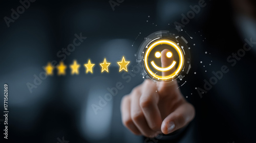 Mão interage com fluxo de jornada do cliente, estrelas de avaliação e ícone feliz ao final. Conceito de encantamento, usabilidade e sucesso do cliente. Fundo neutro com espaço negativo