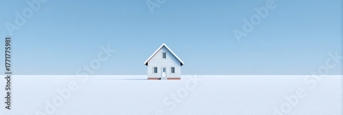 Minimalist white house stands alone in snowy winter landscape. simple home architecture under clear blue sky, creating serene mood of peaceful solitude