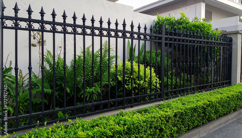 植栽に囲まれた庭を鋳物アイアンフェンスが優雅に守る洗練されたエクステリア