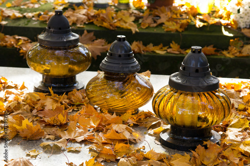 Szklane znicze na grobie, otoczone jesiennymi liści. Święto Zmarłych i Dzień Wszystkich Świętych w Polsce.