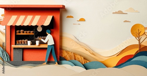 Papercraft scene depicts small shop, person buying drink. Landscape background features hills, tree, clouds. Warm color palette dominates composition.