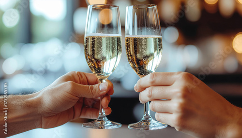 Champagne glass toast. Photo for describing happy celebration such as new years eve, wedding, anniversary, valentine, graduation, job promotion, victory and other social events.