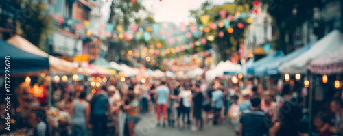 Bustling street market outdoor festival people crowd colorful bunting vendor tents evening lights