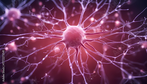 Microscopic view of a neuron with branching axons under vibrant colors in a scientific setting Generative AI