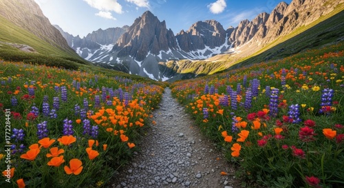 Stunning alpine meadow bursting with vibrant wildflowers leading to majestic snow-capped mountains under a serene blue sky, a perfect scene for travel and adventure seekers
