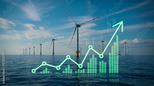 Offshore wind turbines rise from the ocean with a glowing green financial growth chart superimposed symbolizing renewable energy investment and economic progress