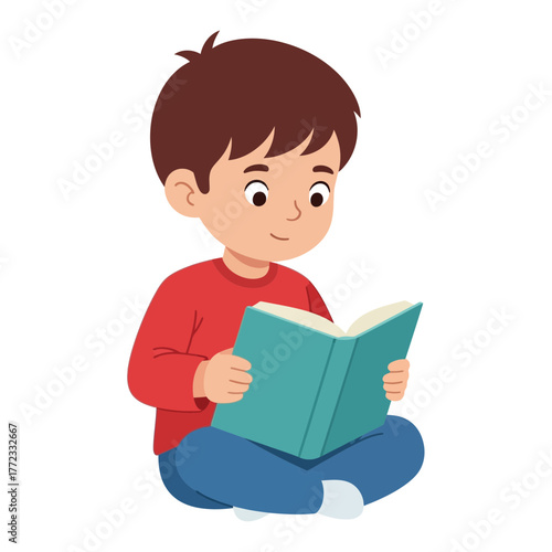 A young boy sits cross-legged, engrossed in reading a book with open pages.