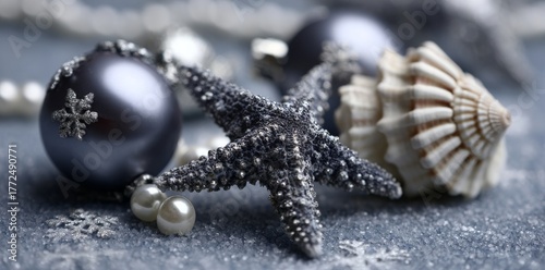 The sandy surface features an artistic arrangement of various seashells, starfish, and dainty snowflake shapes, all accentuated by sparkling water droplets that elevate the beach-inspired display