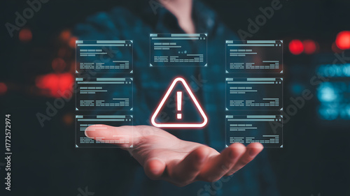 Urgent cybersecurity threat detected with flashing warning sign and data alerts showcased in hand, calling for immediate action and digital protection