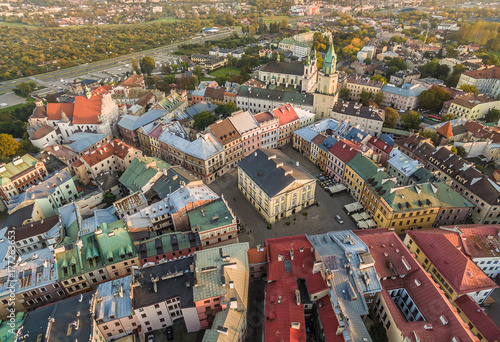 Lublin - stare miasto z Trybunałem Koronnym i wieżą Trynitarską widziane z powietrza. Widok z lotu ptaka.