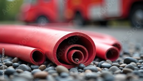Durable fire hose on rugged terrain A close up, low angle shot of a thick, red fire hose tightly coiled on a bed of rough, grey gravel and scattered rocks. Natural, harsh sunlight illuminates the