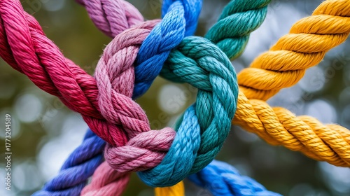 Vibrant braided ropes intricately knotted together symbolizing strong connection, unity, and unbreakable teamwork in a dynamic, colorful display.