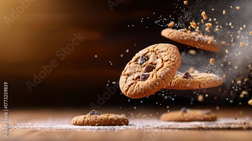 Freshly Baked Cookies in Motion with Crumbs and Sugar Dusting on Wooden Surface