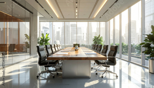 大きな窓から光が差し込むモダンなオフィスの会議室。黒い革張りの椅子と木製テーブルが並ぶ、洗練されたビジネス空間の室内風景