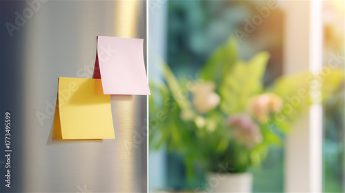 Sticky notes in soft sunlight on glass window with blurred flowers behind, concept of organization, creativity and planning with calm mood.