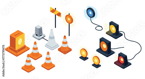 Isometric traffic cones and safety lights set with bright colors and shadows