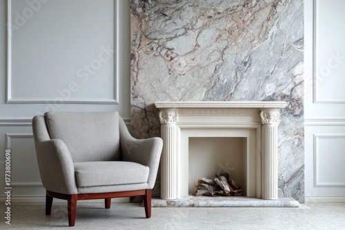 A refined interior features a classic armchair beside an ornate fireplace with marble.