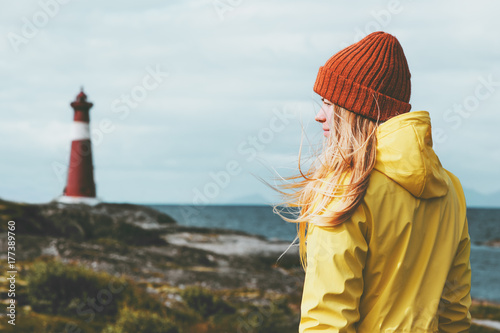 Woman sightseeing lighthouse sea landscape in Norway Travel Lifestyle concept scandinavian vacations outdoor. Blonde girl hair on wind wearing orange hat and yellow raincoat