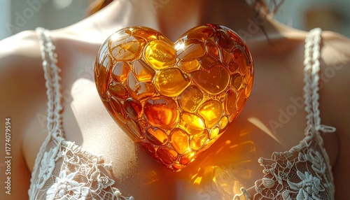 Bursztynowe serce jako symbol miłości oraz kobieta ubrana w koronkową bluzkę,