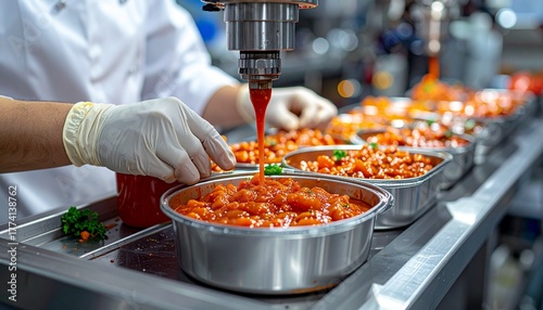 ステンレスの作業台上で自動ノズルがソース容器に正確に充填され、手元がトレー位置を微調整する食品工場のシーン。 明るく衛生的な製造環境と管理された工程が、信頼性と品質重視の生産体制を象徴します。ソース,充填,ノズル,容器,トレー,手元,食品工場,製造,ライン,自動化,ステンレス,設備,清潔,衛生管理,食品衛生,液体充填,惣菜,中央厨房,セントラルキッチン,調理台,手袋,品質管理,検品,精密,効率,食