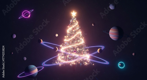 A Cosmic Christmas A Festive Tree Adorned with Lights and Planets in Outer Space