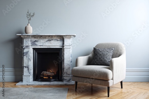 Cozy armchair beside a marble fireplace with a vase and a rug.