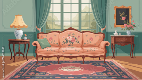 Cozy illustration of a vintage living room with floral sofa and detailed interior design.