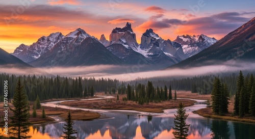 A serene mountain landscape with a calm river flowing through a forested valley at sunset, featuring majestic snow-capped peaks and a vibrant sky with warm hues.