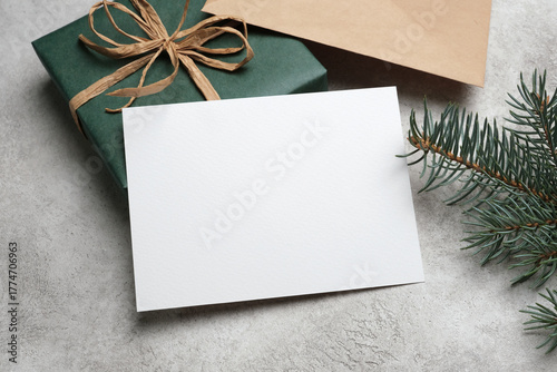 #1774706963The setup showcases a blank greeting card mockup placed near gift boxes, pine tree branches, and an envelope, creating a cozy holiday atmosphere
