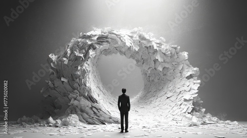 A man in a suit stands facing a massive swirling wave of scattered papers forming a tunnel-like vortex in a monochrome setting, evoking feelings of overwhelm and contemplation