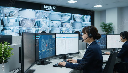 ビジネスシーン:救急コールセンターの風景 ヘッドホンを付けたオペレーター