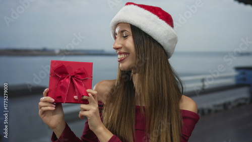 Woman with bare shoulders holds red gift box and smiles on seaside street; holiday celebration warmth cheer.