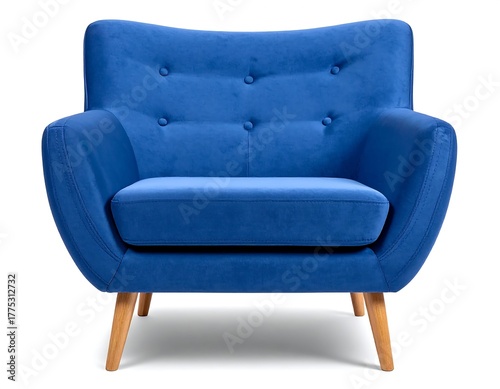 Plush, blue armchair with wooden legs, button details, isolated